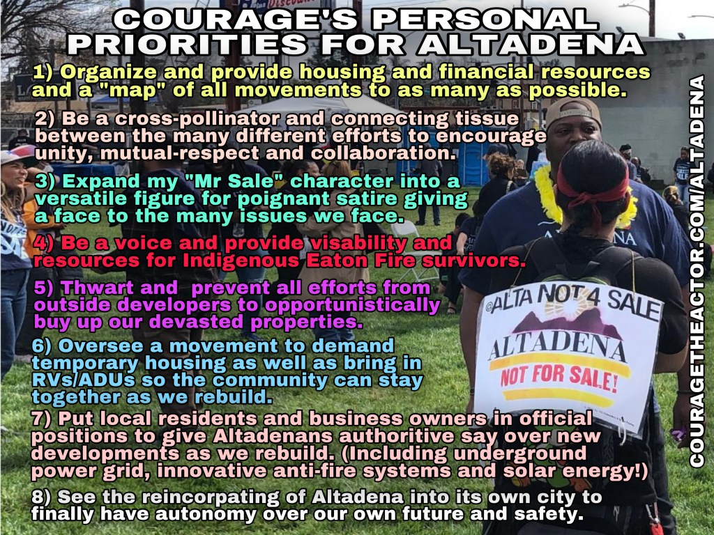 My name is Courage and I’m a professional resource organizer and experienced community activist. This is my ongoing commitment to my community. I’m the guy the you can come to for answers about anything and to give you a mental map for ALL things Altadena!