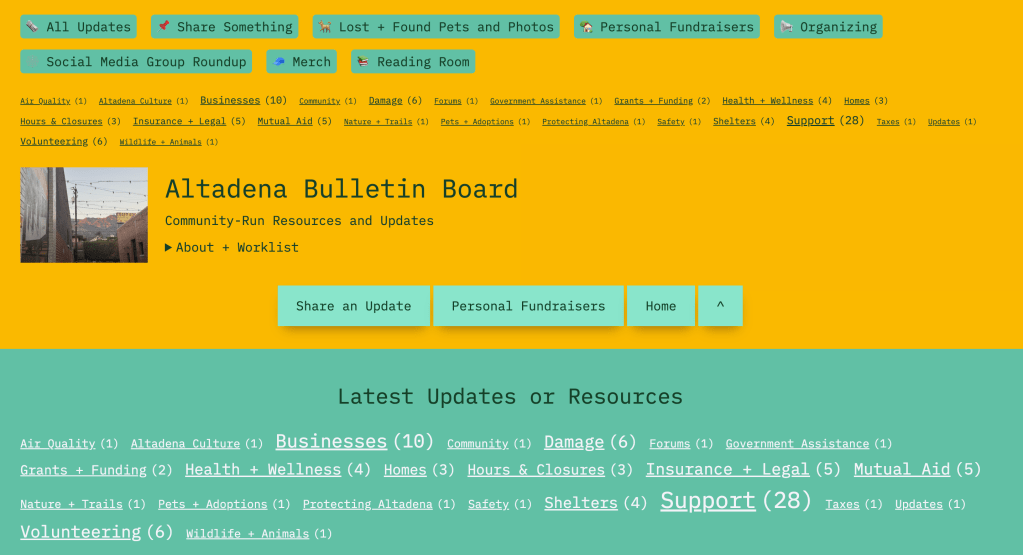 Like never before, Altadena has become an organizer’s town working to address every issue, crisis and need that we’ve been confronted with. Here is a clear directory of the central resident-run local orgs that have been leading the charge and how they’re distinctive from each other (according to me.) They all rock and I’m a fan of every one of them!
