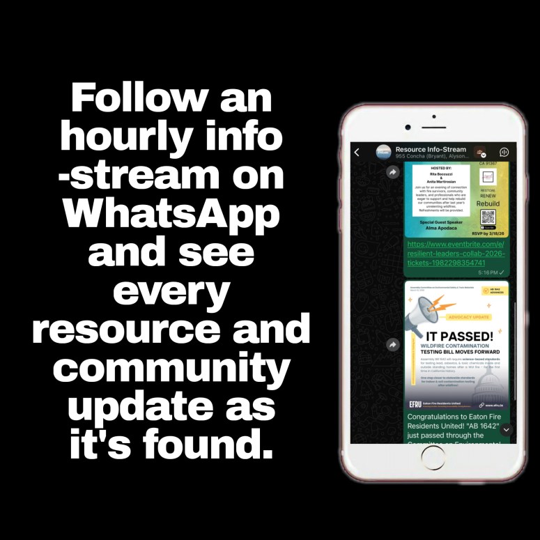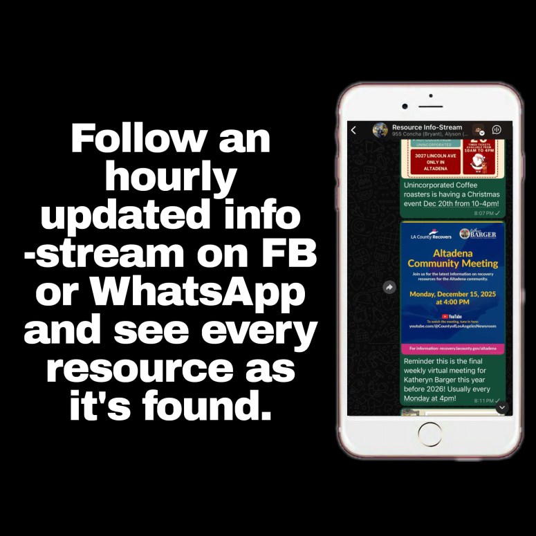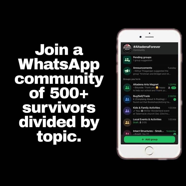 Below are all the resources I’ve found since the disaster organized in one place, of which I’m constantly working to update. Please consider joining the Altadena Forever What’sApp community of 500+ survivors or my info-streams on What’sApp or Facebook where I FIRST post everything I find practically by the hour. Please also add the official Altadena Community Recovery Calendar to your Google Calendar app! The most comprehensive calendar in town!