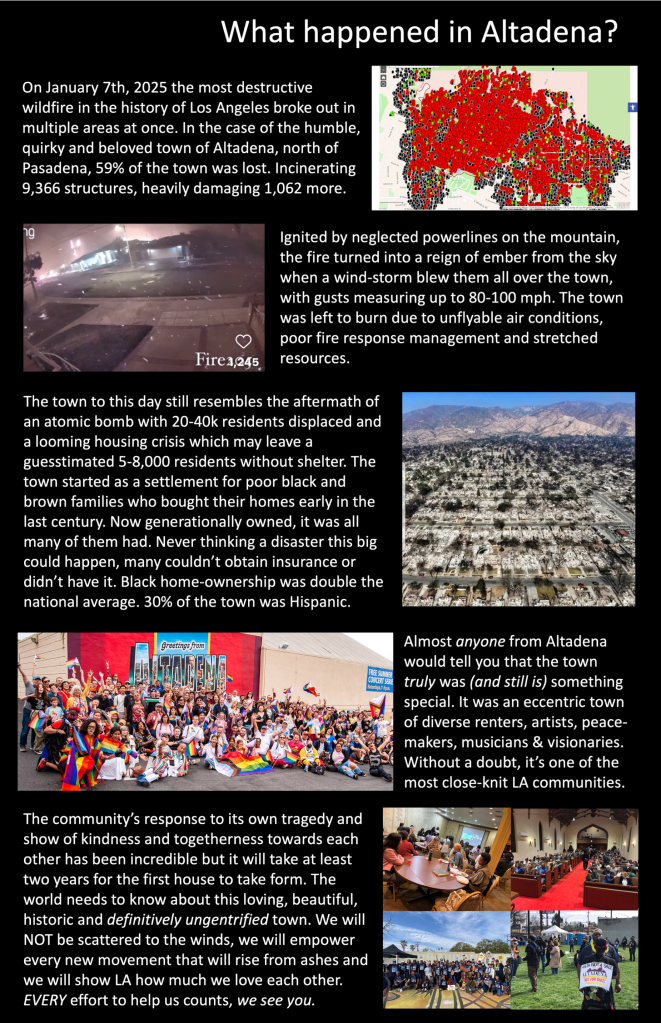 The 2025 Eaton Fire has destroyed most of my beloved town of Altadena, majorly impacting my life in the process. Please consider supporting me so I can spend every possible moment to organizing and serving the most loving town anywhere.