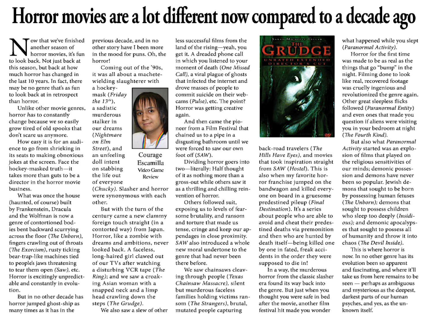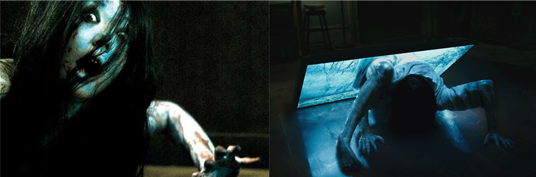 We were then introduced to a faceless, long haired girl crawling out of our TV’s after watching a disturbing VCR tape (The Ring) and a croaking Japanese woman with a broken neck and a limp head crawling down the stairs (The Grudge.)