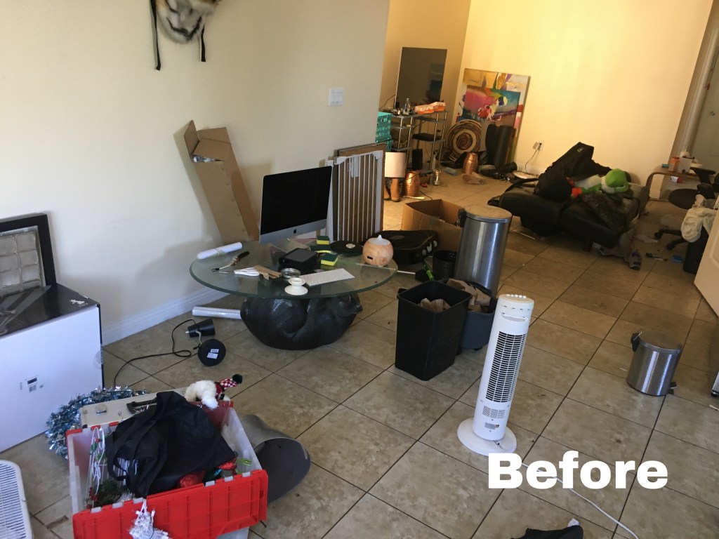- STEP 4 – CLEAN. Once everything has been categorized, I will now be able to move major structures around into our basic floor plan and clean those structures, the floors and furniture to ready them for the final step! (Note: Most of the time, spaces will be so full that I will be unable to clear the items completely from the space while doing this but I’ve become very good at doing Step 3-5 all at the same time!)